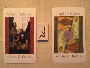 Arguments are in the air. Again. Still. Both cards show a pair of people, so, as much as you might want to be alone and be left alone, today requires dealing with others. Angbroda appears in Ac (which is reversed) as a warning not to waste your strength on pointless conflicts. Hold the line on what is truly important, and let go of what doesn’t matter.