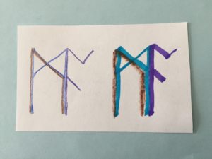 The bindrune on the left was done in colored pencil. The one on the right was done with fine point calligraphy markers. They are shown in two different media to give an idea of how the same bindrune looks different depending on how it is created.