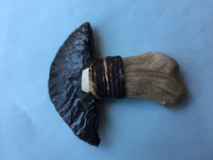 We had a wonderful conversation, in which Duckhee explained the process of flintknapping, which is making blades from stone. Obsidian is volcanic rock, sometimes called volcanic glass. The handles are made of wood or antler (sustainably gathered), and wrapped with leather. He also makes pendants (you can see a couple in the photo).