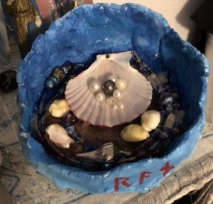It absorbed the acrylic paint easily, and rather a lot of it. However, the paint dried quickly because of that, so painting actually took less time than expected. I chose to paint it in varying shades of blue with spots of white, like the blue ocean waves flecked with foam. The inside is painted shades of sandy brown on the bottom, representing the ocean floor.
